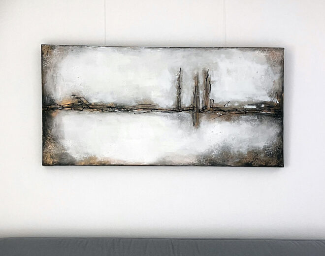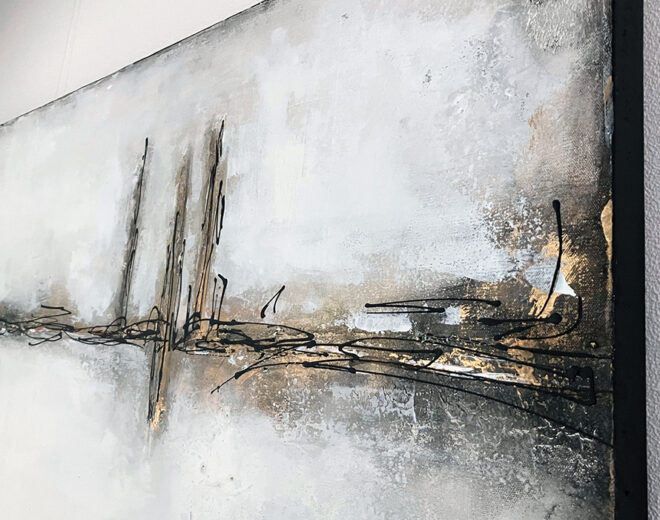 Das Leinwandbild zeigt eine abstrakte Landschaft mit ausgeprägter Struktur in verschiedenen Weißtönen, ergänzt durch metallische Farbnuancen und schwarze Akzente. Die Oberfläche verleiht dem Bild eine lebendige Tiefe und macht es zu einem stilvollen Blickfang.